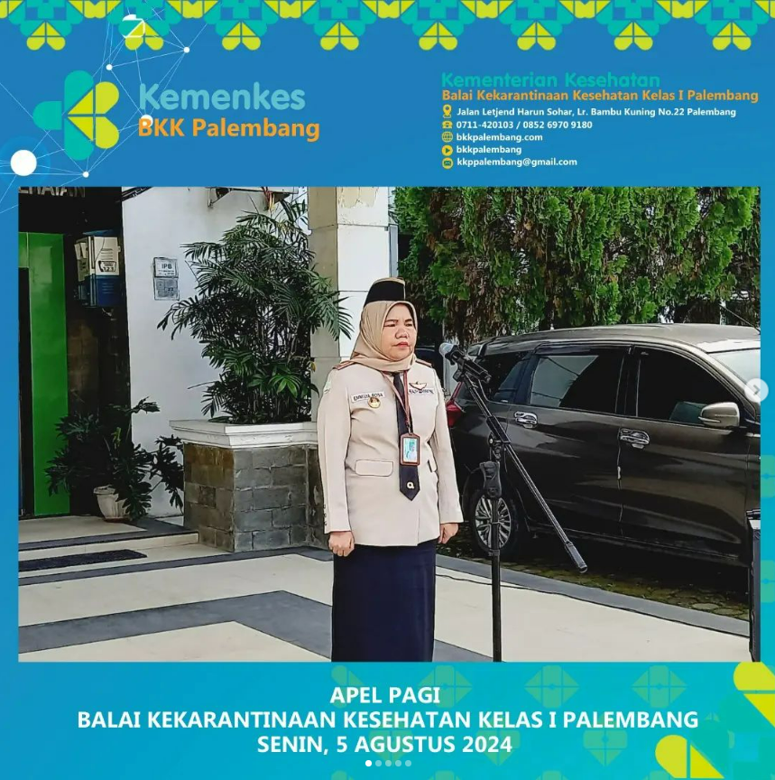 Hari ini kembali dilaksanakan Apel Senin Pagi di Balai Kekarantinaan Kesehatan Kelas I Palembang. Bertindak sebagai Pembina Apel, Ibu Kepala Balai, Emmilya Rosa, SKM, MKM.