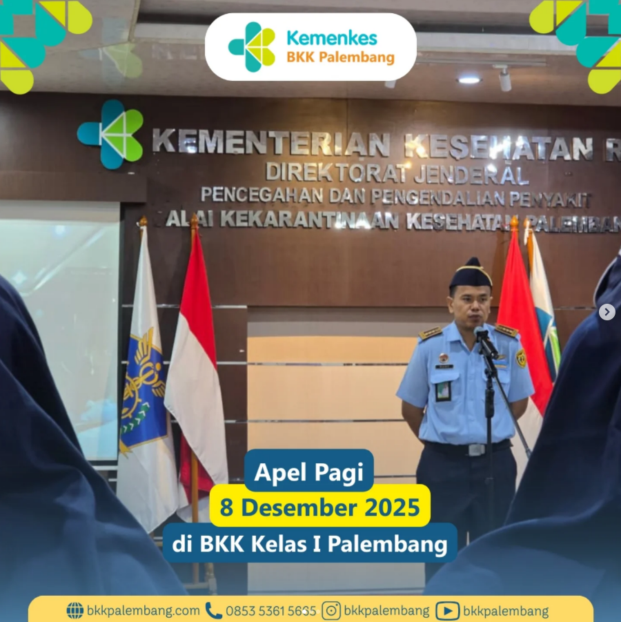 Senin, 8 Desember 2025, BKK Kelas I Palembang melaksanakan apel pagi rutin di Aula BKK Palembang yang dipimpin oleh Ketua Tim Kerja 1 Surveilans dan Penindakan Kekarantinaan Kesehatan, Bapak Rudy Raymond, SKM, M.Kes. Apel pagi diikuti oleh seluruh pegawai ASN dan tenaga outsourcing.