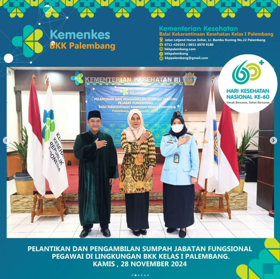 Kamis 28 November 2024 bertempat di aula BKK Kelas I Palembang dilaksanakan kegiatan pelantikan dan pengambilan sumpah jabatan fungsional pegawai di lingkungan Balai Kekarantinaan Kesehatan Kelas I Palembang.