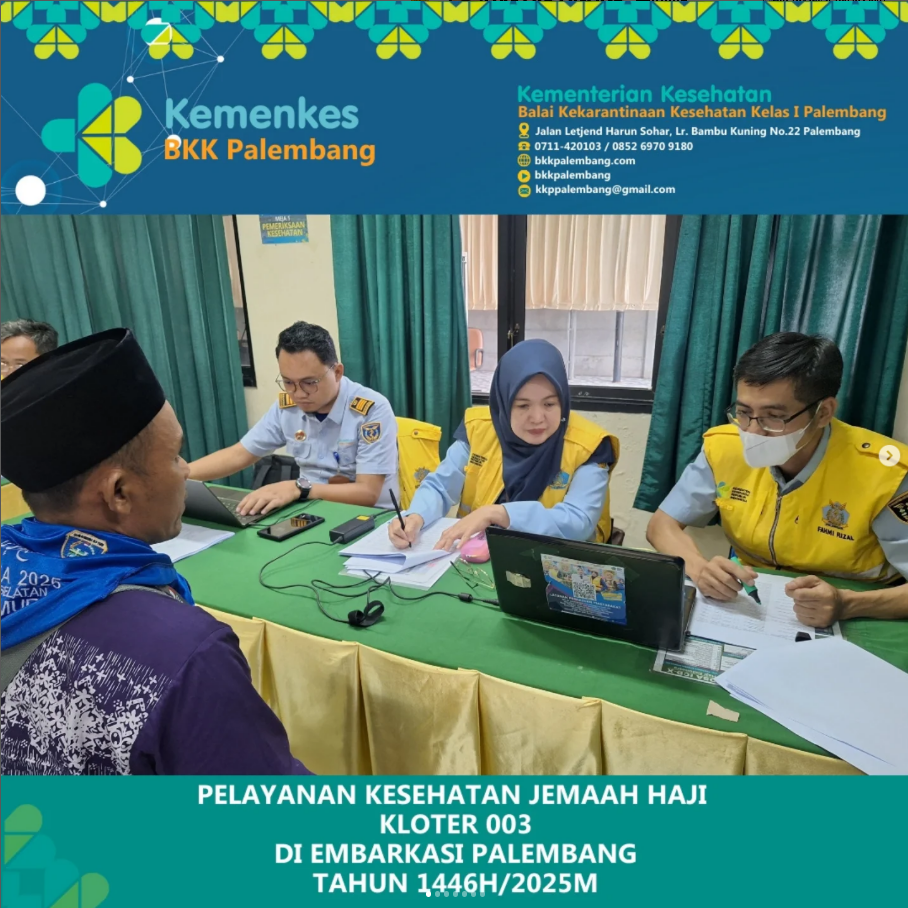 Pagi ini Senin, 5 Mei 2025 Calon Jemaah haji Kloter 003 PLM sebanyak 370 orang yang berasal dari Kab Oku Timur tiba di Embarkasi Palembang dan telah dilakukan Pemeriksaan Tahap Ketiga (Pemeriksaan Kesehatan Akhir) oleh Balai Kekarantinaan Kesehatan Kelas I Palembang untuk menentukan status kelaikan terbang sebelum menuju tanah suci.