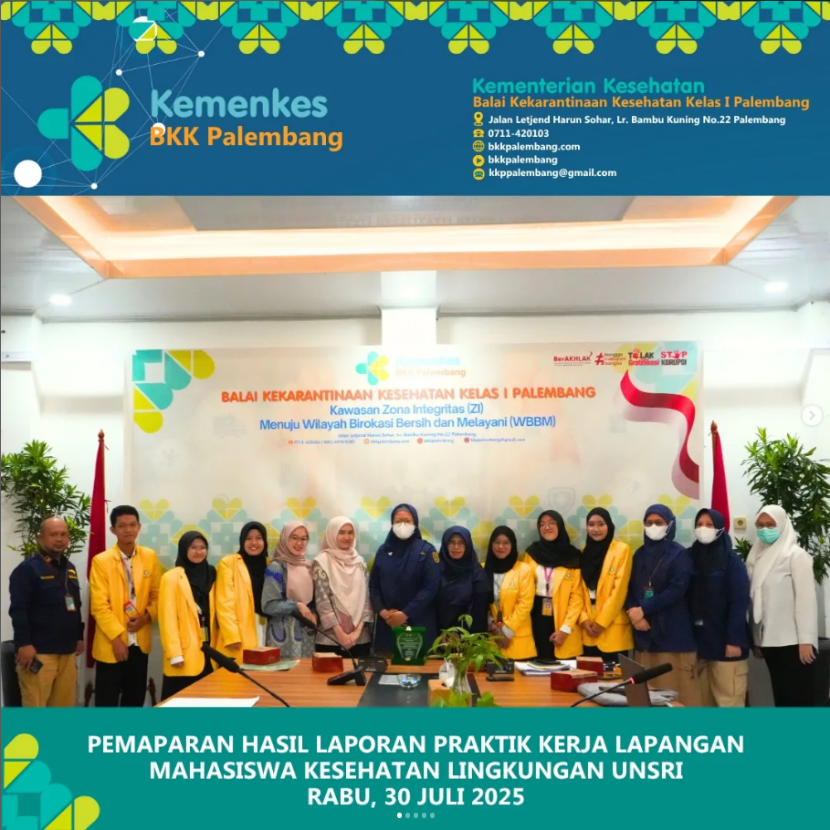 Sebanyak 6 mahasiswa/i Program Studi Kesehatan Lingkungan Universitas Sriwijaya telah menyelesaikan kegiatan Praktik Kerja Lapangan (PKL) di BKK Kelas I Palembang.