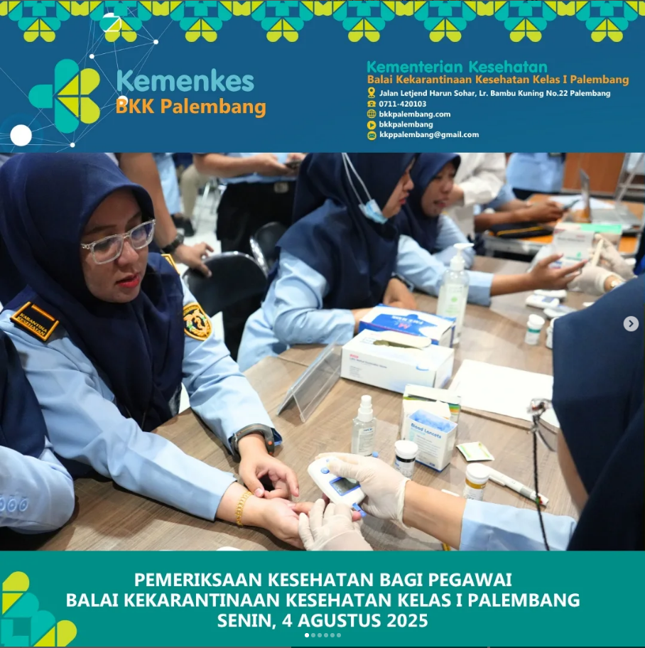 Pada hari ini, 4 Agustus 2025, seluruh pegawai Balai Kekarantinaan Kesehatan (BKK) Kelas I Palembang telah melaksanakan pemeriksaan kesehatan dalam rangka Pengukuran Kebugaran Triwulan III di Kantor Induk BKK Kelas I Palembang.