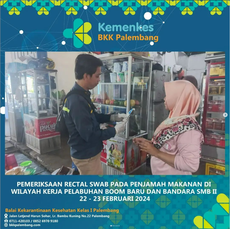 Pada hari Kamis, 22 Februari 2024 dan Jumat, 23 Februari 2024 dilakukan pemeriksaan rectal swab pada penjamah makanan di wilayah kerja Pelabuhan Boom Baru dan Bandara SMB II Palembang. Jumlah penjamah makanan yang diperiksa di wilayah kerja pelabuhan boom baru sebanyak 12 orang dan di bandara SMB II sebanyak 38 orang. Sampel rectal swab dari penjamah makanan ini selanjutnya dikirim ke BBLK Palembang untuk dilakukan pemeriksaan.