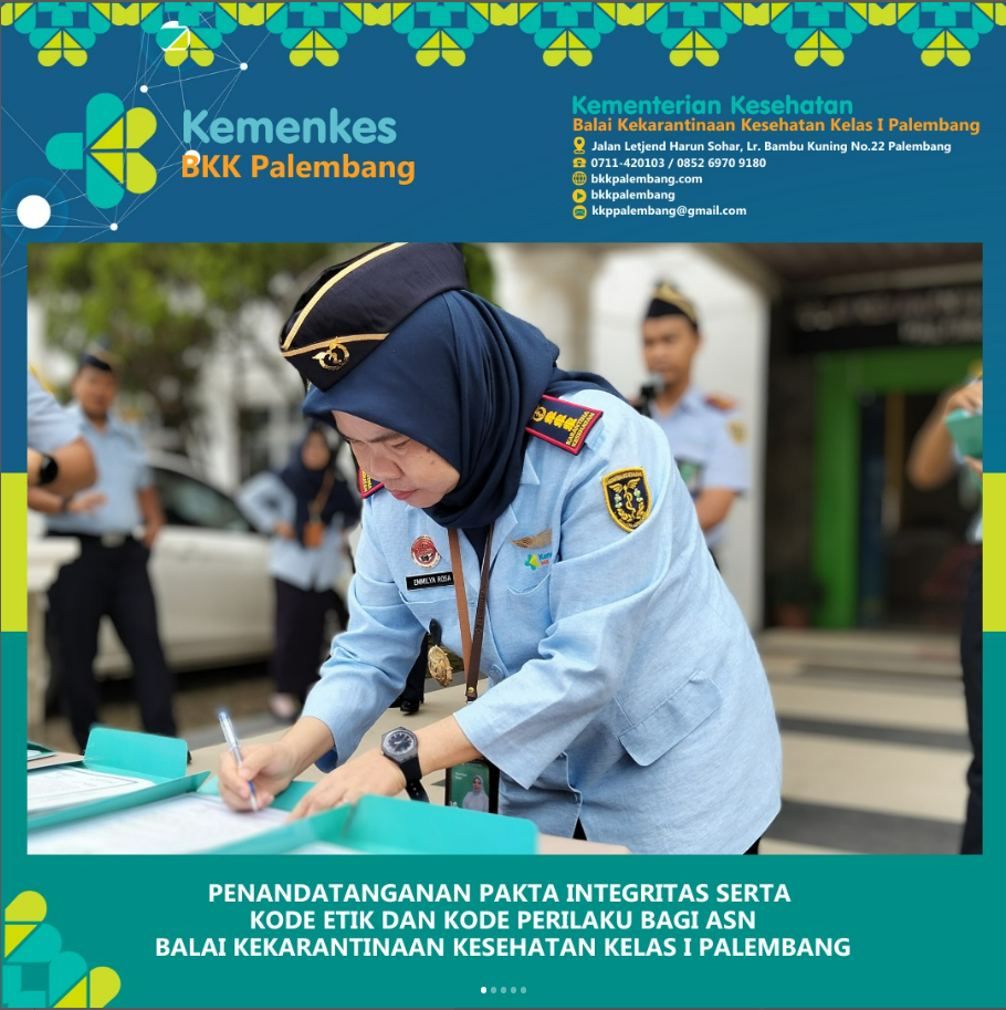 Penandatanganan Pakta Integritas dan Kode Etik ini merupakan komitmen Balai Kekarantinaan Kelas I Palembang untuk mempertahankan kepercayaan publik dan meningkatkan kualitas layanan. Tentu komitmen ini tidak ada tercapai tanpa dukungan dari semua pihak, stakeholder maupun masyarakat.