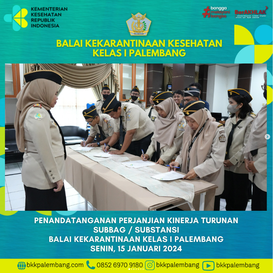 Perjanjian Kinerja turunan sebagai bentuk komitmen pelaksanaan Indikator Kinerja Substansi untuk mendukung tercapainya target Indikator Kinerja Utama tahun 2024 di Balai Kekarantinaan Kesehatan Kelas I Palembang.