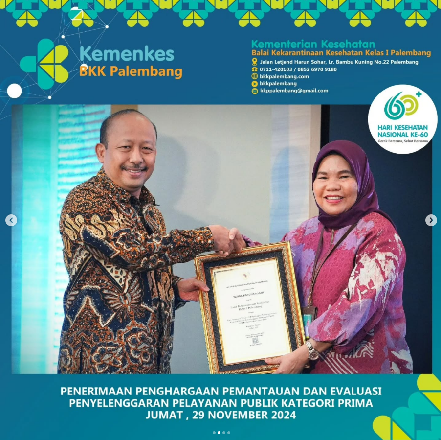 Balai Kekarantinaan Kesehatan Kelas I Palembang berhasil meraih penghargaan PRIMA pada penilaian Pemantauan dan Evaluasi Penyelenggaran Pelayanan Publik (PEKPPP) secara Mandiri tahun 2024 oleh Kementerian Kesehatan. Diberikan pada Malam Anugerah Hari Kesehatan Nasional Ke-60 pada hari Jumat, 29 November 2024, Ibu Kepala Balai, Emmilya Rosa, SKM., MKM. hadir secara langsung menerima penghargaan.