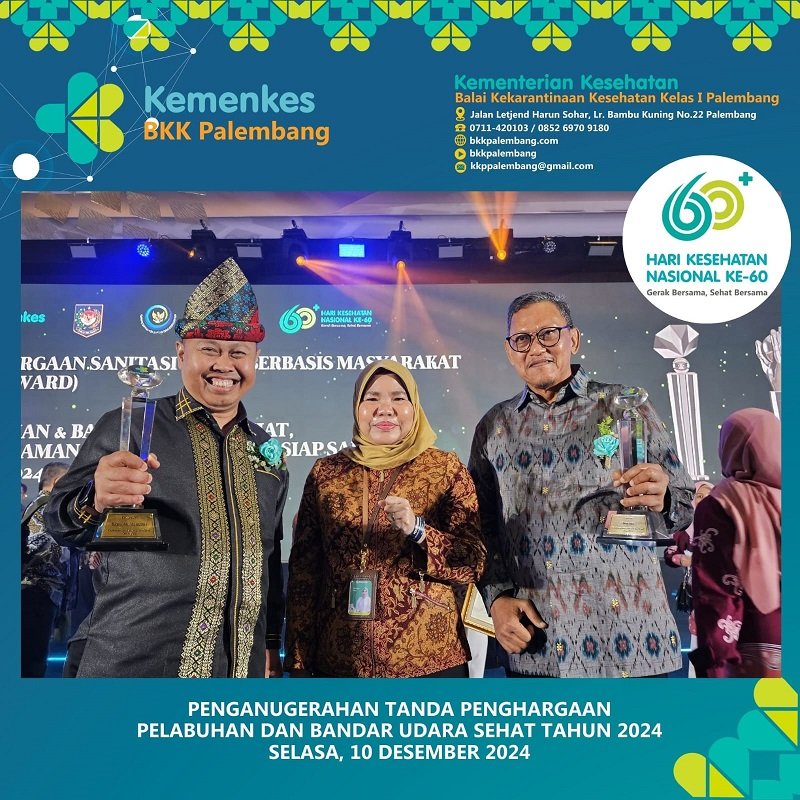 Alhamdulillah pada tahun ini Pelabuhan Boom Baru Palembang dan Bandara Sultan Mahmud Badaruddin II Palembang berhasil meraih penghargaan tersebut berdasarkan Kep. Menkes RI Nomor HK. 01.07/MENKES/1817/2024 tentang Penganugrahan Tanda Penghargaan Pelabuhan dan Bandar Udara Sehat Tahun 2024.