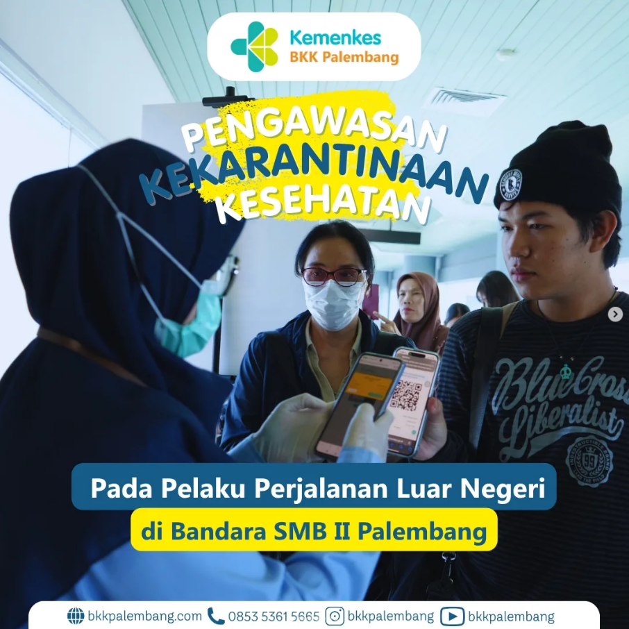 Balai Kekarantinaan Kesehatan (BKK) Kelas I Palembang melaksanakan kegiatan Pengawasan Kekarantinaan Kesehatan terhadap Pelaku Perjalanan Luar Negeri (PPLN) di Bandara Sultan Mahmud Badaruddin II Palembang.