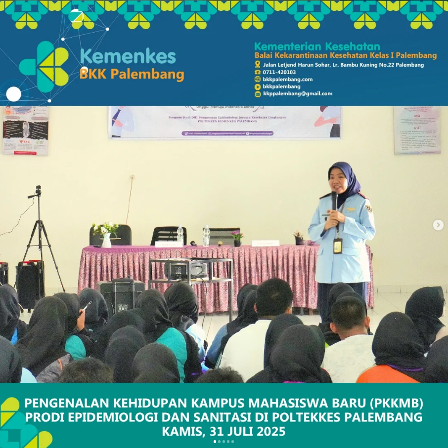 Hari ini, 31 Juli 2025, Kepala Balai Kekarantinaan Kesehatan Kelas I Palembang, Ibu Emmilya Rosa, SKM, MKM, memberikan pemaparan materi tentang Sanitasi dan Epidemiologi kepada mahasiswa baru Poltekkes Kemenkes Palembang.