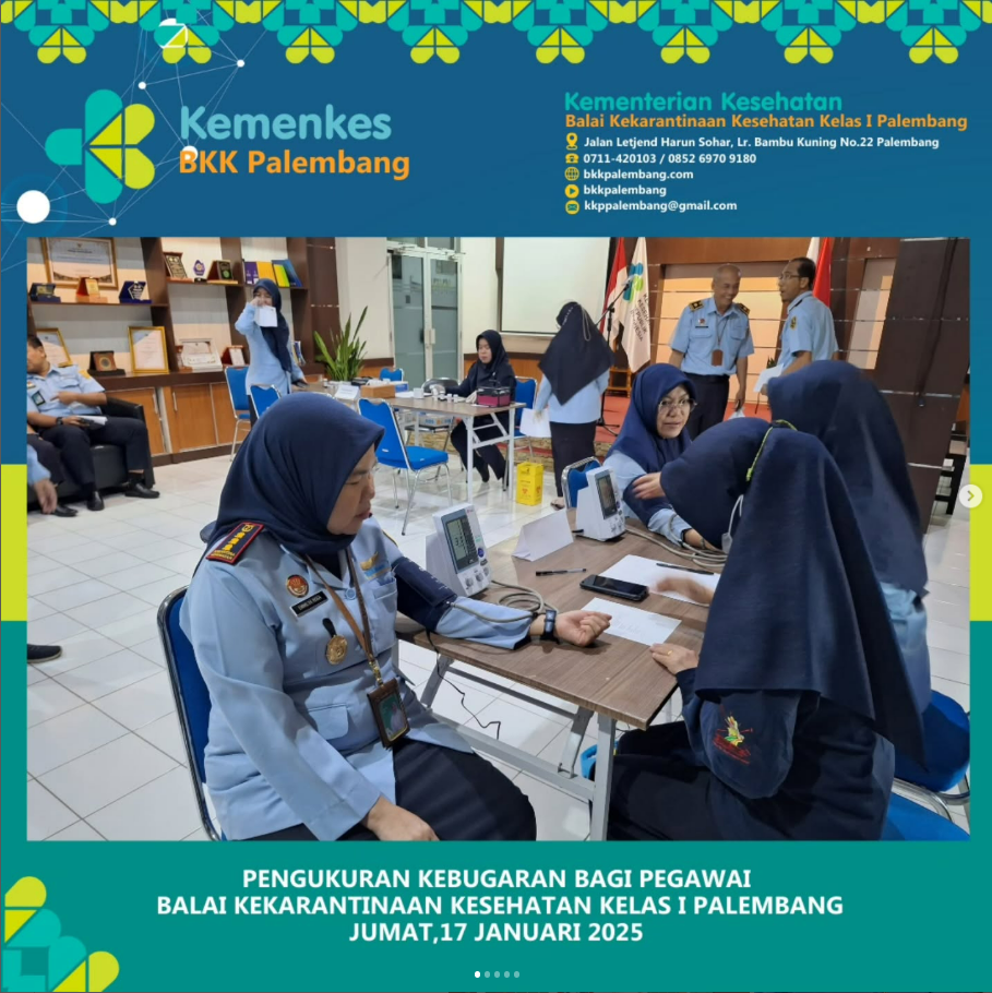 Pengukuran kebugaran akan dilaksanakan secara berkala per 3 (tiga) bulan yaitu pada Bulan Januari, April, Agustus, dan Oktober. Kegiatan ini sebagai sarana monitoring kondisi kesehatan seluruh pegawai BKK Kelas I Palembang.