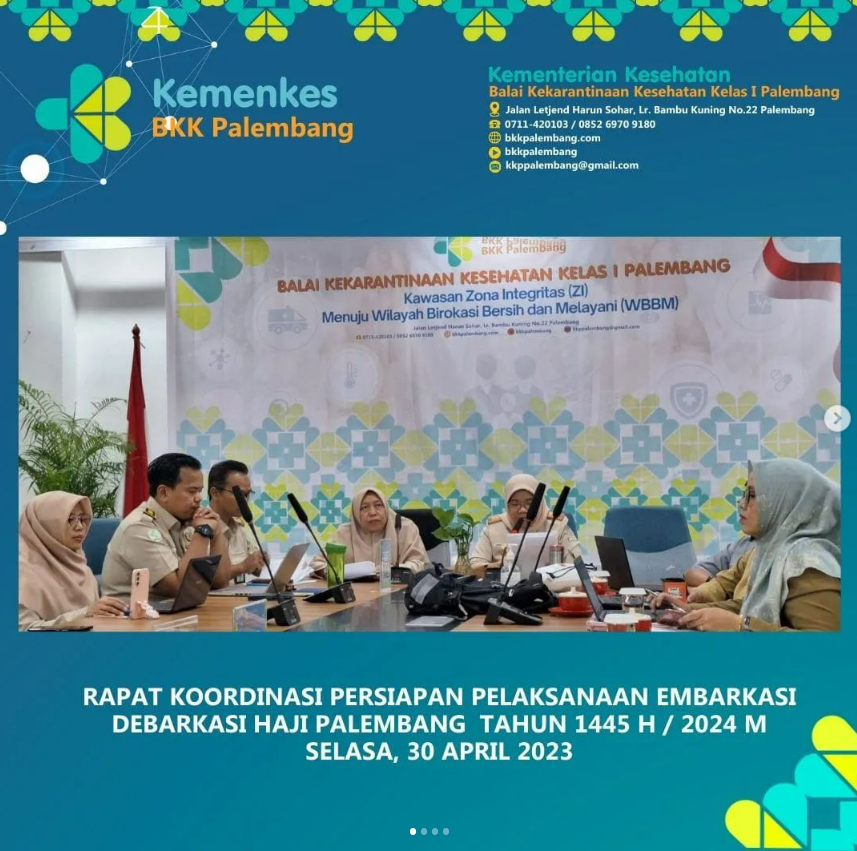 Pada hari Selasa, 30 April 2024, telah dilaksanakan Rapat Koordinasi Persiapan Pelaksanaan Embarkasi/Debarkasi haji Palembang tahun 1445 H / 2024 M di Ruang Rapat Kantor Balai Kekarantinaan Kelas I Palembang. Dibuka oleh Kepala Balai Kekarantinaan Kesehatan Kelas I Palembang, Emmilya Rosa, SKM, MKM, acara ini dilaksanakan hybrid dan dihadiri oleh lintas sektor yang terkait dengan pelaksanaan Embarkasi Haji Palembang diantaranya Perwakilan dari Kanwil Kemenag Prov Sumsel, Dinkes Prov Sumsel, Kantor Imigrasi Kelas I Palembang, BBLK Palembang, BLKM Palembang, PT Angkasa Pura II , PT Gapura Angkasa, RSUP Moh. Hoesin, RSUD Siti Fatimah Azzahra, RS Ernaldi Bahar, Dinkes Kab/Kota, Kantor Kemenag Kab/Kota, Puskesmas Kab/kota dan pegawai BKK Kelas I Palembang yang tergabung dalam kepanitiaan Embarkasi Palembang.
