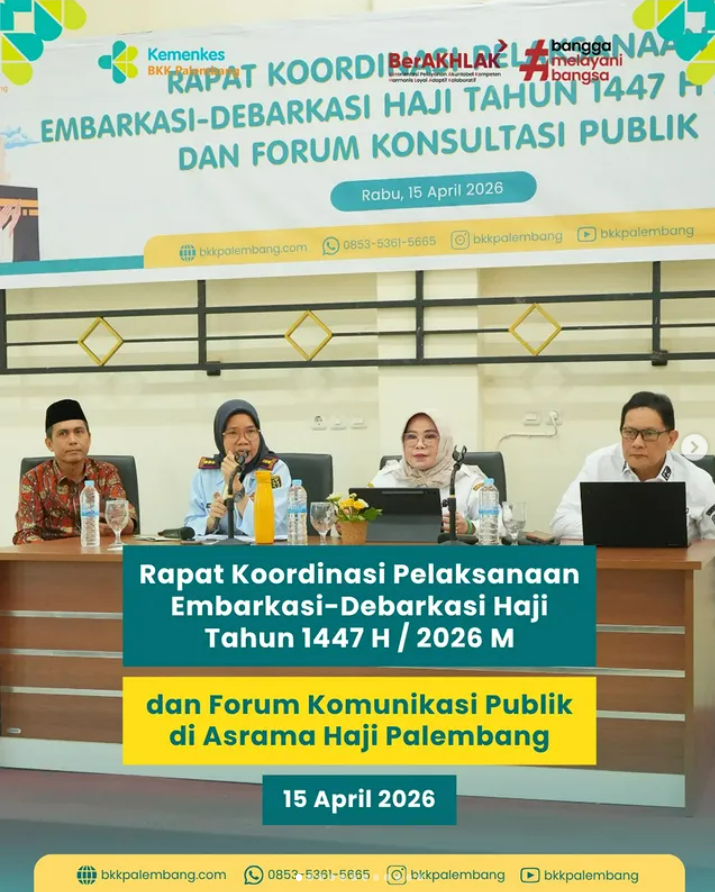 Rabu, 15 April 2026, BKK Kelas I Palembang melaksanakan Rapat Koordinasi Persiapan Pelaksanaan Embarkasi–Debarkasi Haji Tahun 1447 H / 2026 M yang dirangkaikan dengan Forum Komunikasi Publik, bertempat di Asrama Haji Palembang.