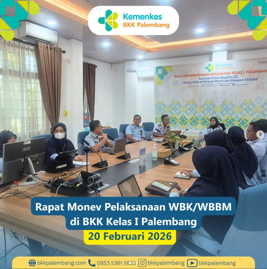 Jumat, 20 Februari 2026, telah dilaksanakan rapat monitoring dan evaluasi (monev) pelaksanaan WBK/WBBM di Ruang Rapat BKK Kelas I Palembang. Rapat monev WBK/WBBM ini dipimpin langsung oleh Kepala BKK Kelas I Palembang, Ibu Emmilya Rosa, SKM, MKM.