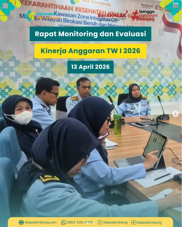 Senin, 13 April 2026, BKK Kelas I Palembang melaksanakan Rapat Monitoring dan Evaluasi (Monev) Kinerja Anggaran Triwulan I Tahun 2026. Kegiatan ini berlangsung di ruang rapat Kantor Induk dan dipimpin langsung oleh Kepala BKK Kelas I Palembang, Ibu Emmilya Rosa, SKM, MKM.