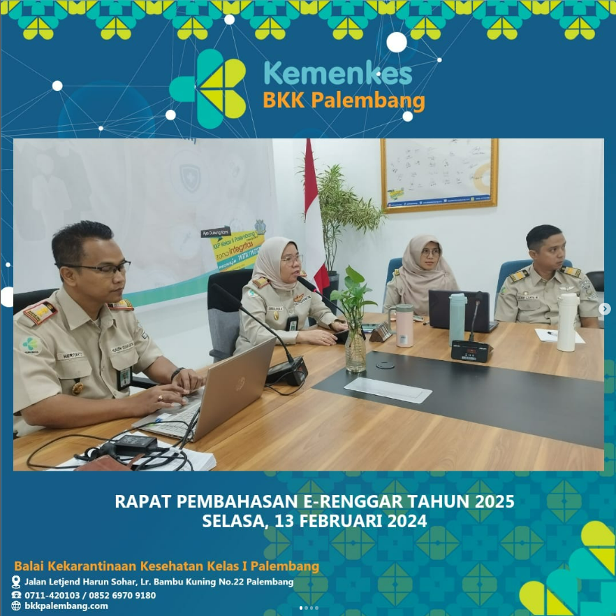 Pada hari Selasa, 13 Februari 2024, bertempat di Ruang Rapat Balai Kekarantinaan Kesehatan Kelas I Palembang, diadakan rapat pembahasan terhadap pengajuan e-Renggar Tahun Anggaran 2025.