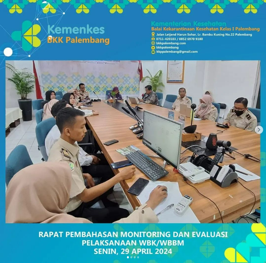 Pembangunan Zona Integritas adalah pembangunan berkelanjutan yang dimulai sejak pencanangan Zona Integritas di sebuah Instansi. Untuk memonitoring pembangunan Zona Integritas di Balai Kekarantinaan Kesehatan Kelas I Palembang, dilakukan Rapat Pembahasan Monitoring dan Evaluasi Pelaksanaan WBK/WBBM secara Hybrid; di Ruang Rapat BKK Palembang dan media Zoom, pada hari Senin, 29 April 2024.