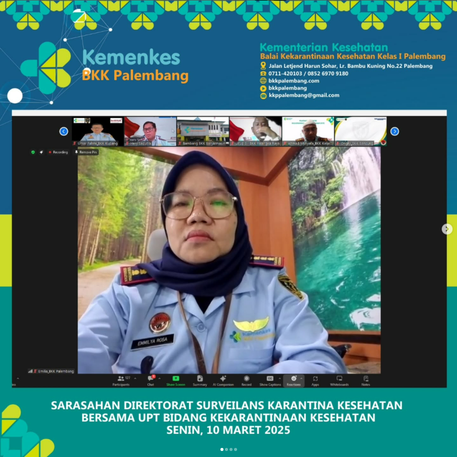 Dalam rangka koordinasi rutin Direktorat Surveilans dan Karantina Kesehatan dengan UPT Bidang Kekarantinaan Kesehatan, Kepala Balai Kekarantinaan Kesehatan Kelas I Palembang, Ibu Emmilya Rosa, SKM, MKM menghadiri acara Sarasahan Direktorat Surveilans Karantina Kesehatan yang dipimpin langsung oleh Bapak Direktur Surveilans dan Karantina Kesehatan serta dihadiri oleh seluruh kepala UPT Bidang Kekarantinaan Kesehatan secara daring pada tanggal 10 Maret 2025.