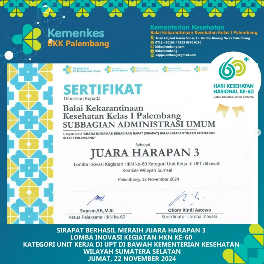 Inovasi Sistem Informasi Kehadiran Rapat (SIRAPAT) Balai Kekarantinaan Kesehatan Kelas I Palembang berhasil meraih Juara Harapan 3 dalam Kompetisi Lomba Inovasi HKN ke-60 Kategori Unit Kerja di UPT di bawah Kementerian Kesehatan Wilayah Sumatera Selatan.