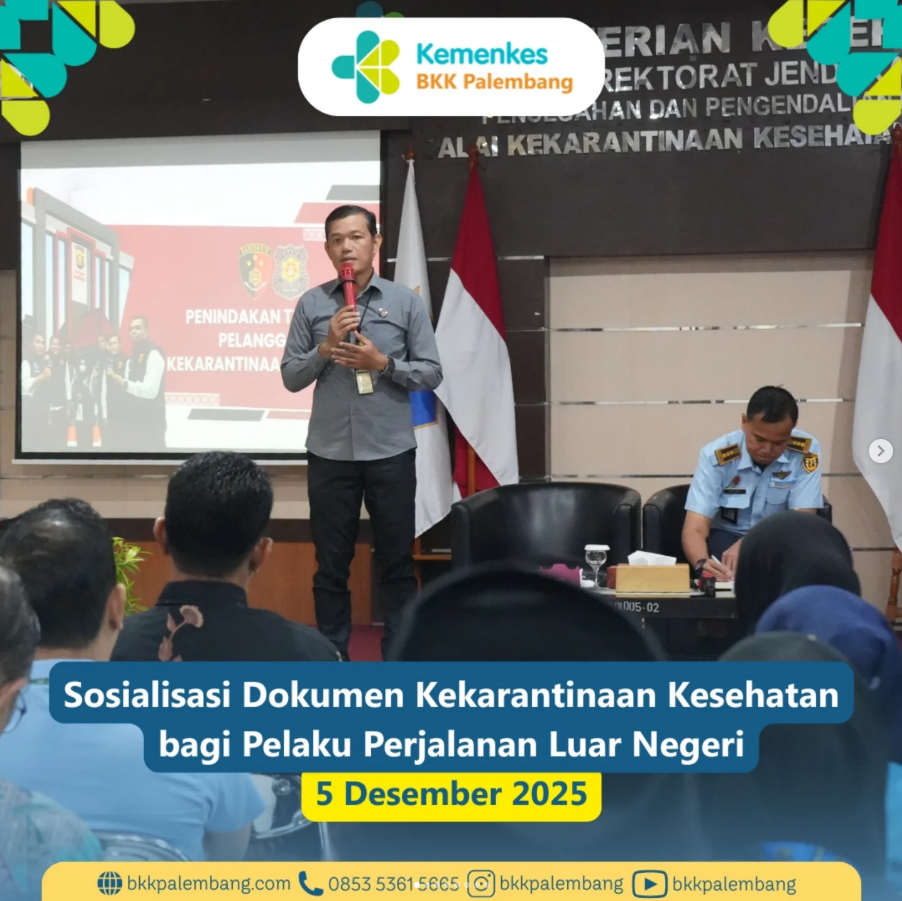 Jumat, 5 Desember 2025, BKK Kelas I Palembang melaksanakan Sosialisasi Dokumen Kekarantinaan Kesehatan bagi Pelaku Perjalanan Luar Negeri (PPLN) yang bertempat di Aula BKK Kelas I Palembang.