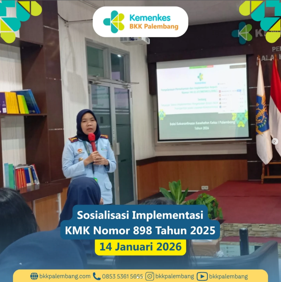 Rabu, 14 Januari 2026, telah dilaksanakan kegiatan internal Sosialisasi Implementasi Keputusan Menteri Kesehatan Nomor HK.01.07/MENKES/898/2025 tentang Petunjuk Teknis Implementasi Pengelolaan Biaya Akomodasi, Uang Harian, dan Transportasi pada Layanan Kekarantinaan Kesehatan. Kegiatan ini diikuti oleh seluruh pegawai BKK Kelas I Palembang.