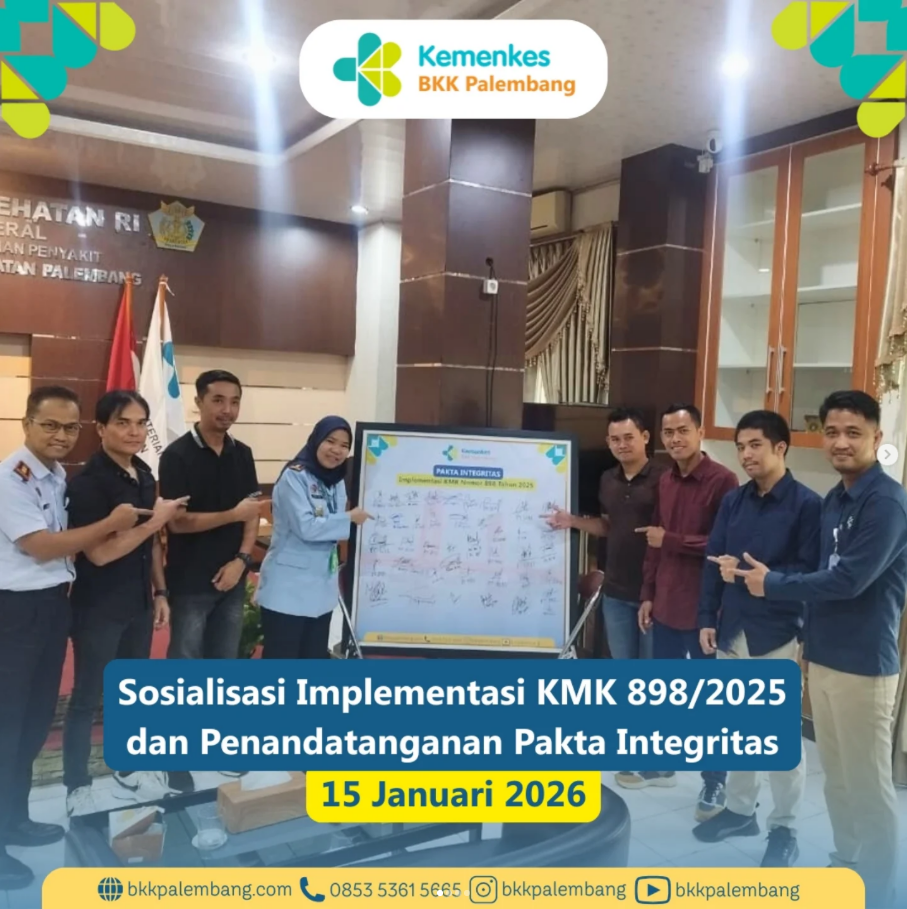 Kamis, 15 Januari 2026, telah dilaksanakan kegiatan Sosialisasi Implementasi KMK Nomor 898 Tahun 2025 dan Penandatanganan Pakta Integritas terkait Implementasi Keputusan Menteri Kesehatan Nomor HK.01.07/MENKES/898/2025 tentang Petunjuk Teknis Implementasi Pengelolaan Biaya Akomodasi, Uang Harian, dan Transportasi pada Layanan Kekarantinaan Kesehatan. Kegiatan ini diikuti oleh agen pelayaran wilayah Sumatera Selatan.