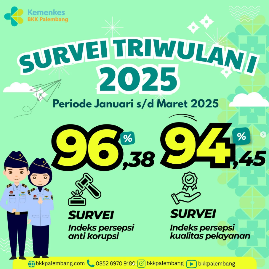 Dengan hasil survei ini, BKK Kelas I Palembang berkomitmen untuk terus mempertahankan dan meningkatkan kualitas layanan publik melalui inovasi, perbaikan berkelanjutan, serta penguatan integritas. Terimakasih atas kepercayaan dan dukungan sobat karkes semua.