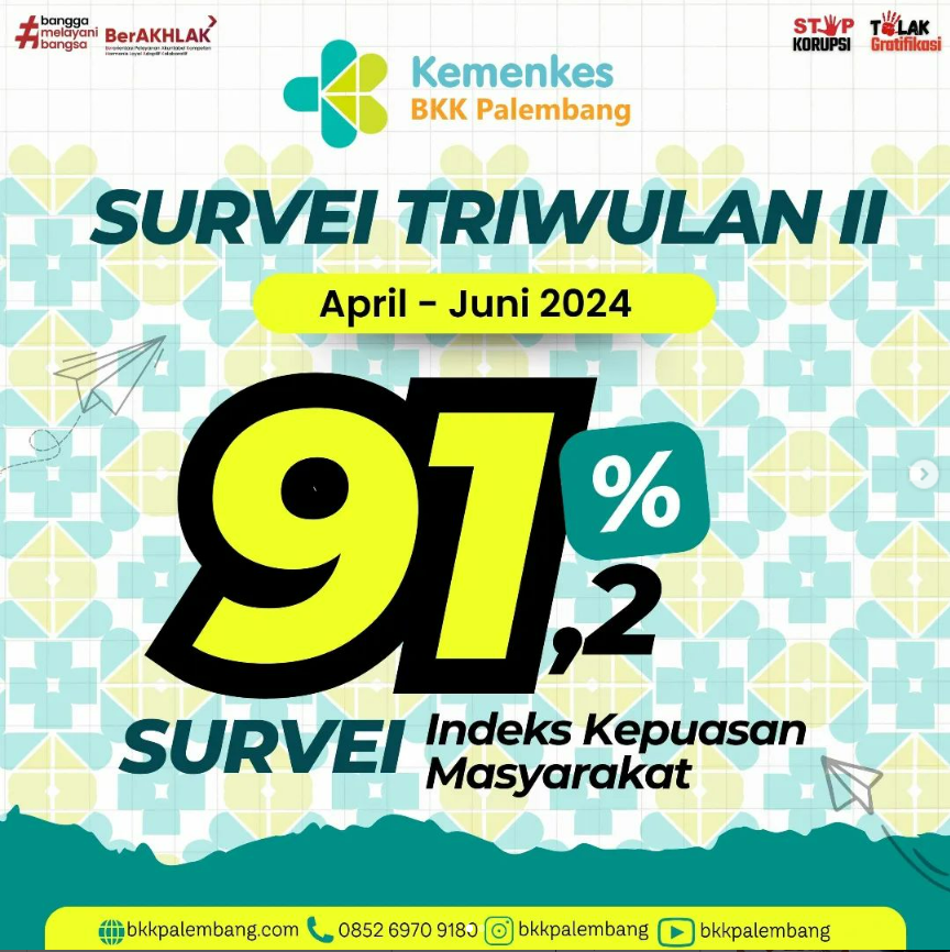 Indeks Kepuasan Masyarakat dari Survei Kepuasan Masyarakat dan IPAK-IPKP di semua Unit Layanan Publik Balai Kekarantinaan Kesehatan Kelas I Palembang Triwulan II telah selesai dilakukan penilaian. Untuk hasil IKM SKM didapatkan indeks 91,2%, IKM IPAK 91,25% dan IKM IPKP 91,32%.