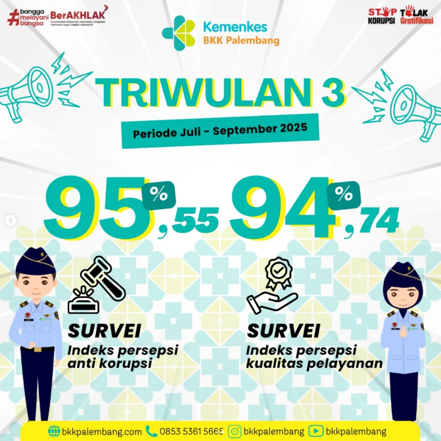 Dalam rangka mewujudkan pelayanan publik yang prima, transparan, dan berorientasi pada kepuasan masyarakat, Balai Kesehatan Kerja (BKK) Kelas I Palembang secara berkala melaksanakan survei untuk mengukur persepsi serta tingkat kepuasan pengguna layanan.