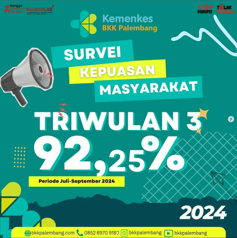 Terimakasih kepada semua pengguna jasa yang telah berpartisipasi dalam survei ini, BKK Kelas I Palembang berkomitmen untuk memberikan layanan publik yang semakin baik. Layanan Pengaduan Masyarakat juga kami buka seluas-luasnya demi menjamin integritas pelayanan publik di BKK Kelas I Palembang.