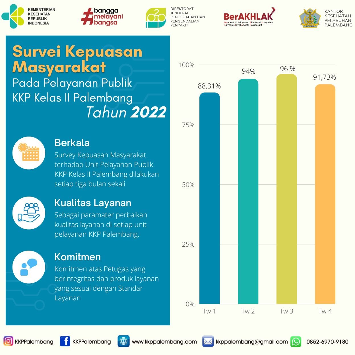 Survey kepuasan masyarakat merupakan paramater perbaikan kualitas layanan di setiap unit pelayanan publik, begitu juga di Kantor Kesehatan Pelabuhan Palembang. Oleh karena itu, KKP Kelas II Palembang secara rutin melakukan Survey Kepuasan Masyarakat terhadap Unit Pelayanan Publik yang dimiliki setiap tiga bulan sekali (triwulan).