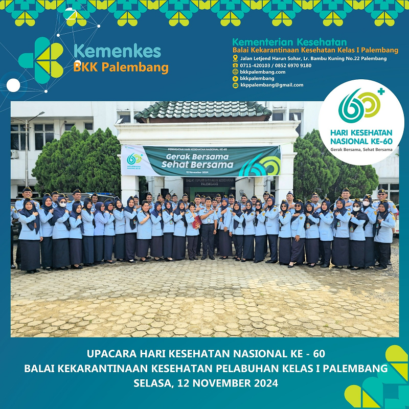 Upacara peringatan Hari Kesehatan Nasional ke-60 dilakukan di halaman kantor Balai Kekarantinaan Kesehatan Kelas I Palembang dengan inspektur upacara dipimpin oleh Kasubag Adum, Bapak Heriyanto, ST, MKM, pada hari Selasa, 12 November 2024.